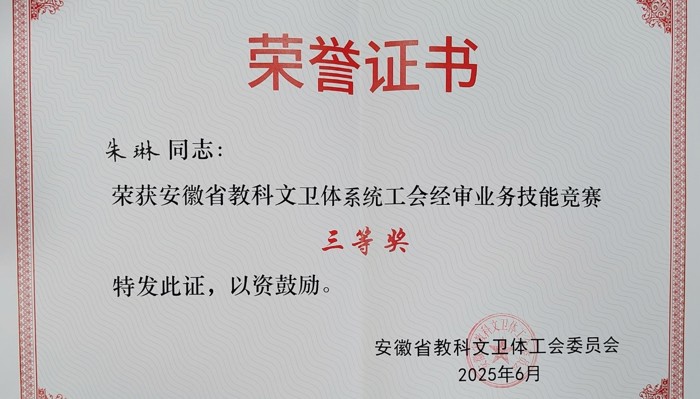 近日,由安徽省教科文卫体工会主办的全省教科文卫体系统工会经审业务技能竞赛决赛圆满落幕。我校会计学院朱琳老师凭借扎实的专业功底和出色的临场发挥,在激烈竞争中脱颖而出,荣获个人三等奖。
