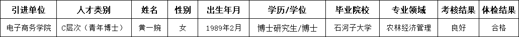 根据《安徽商贸职业技术学院高层次人才引进与管理办法(修订》(商职院字【2024】103号)和《2025年度安徽商贸职业技术学院高层次人才引进公告》规定,经考核、体检,拟引进黄一婉博士来校工作,现公示如下: